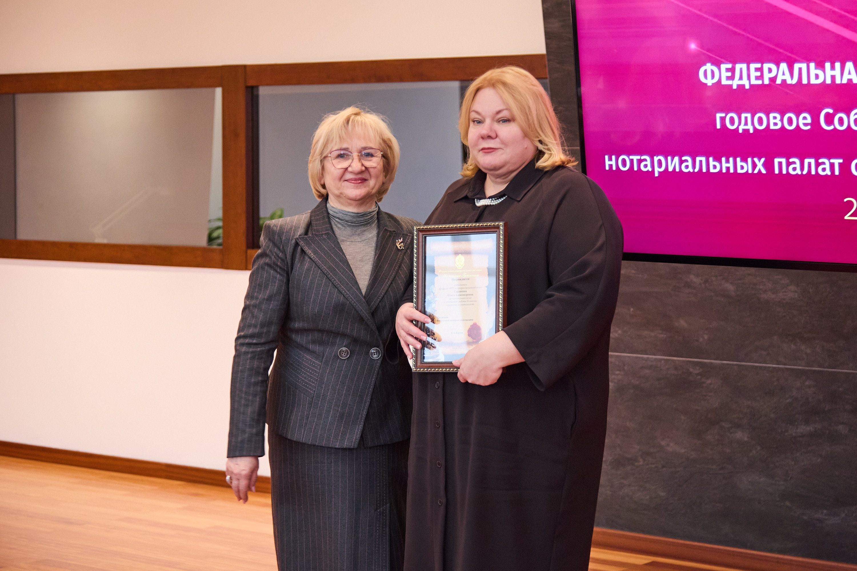 Завершающей частью мероприятия стала церемония награждения. Почетной грамотой ФНП за вклад в развитие российского нотариата были награждены члены Правления ФНП состава 2019-2026 гг.: Наталья Гончарова, Светлана Зылевич, Александра Игнатенко, Кирилл Лазорин, Галина Николаева, Мария Терехова, Марина Эдельштейн.