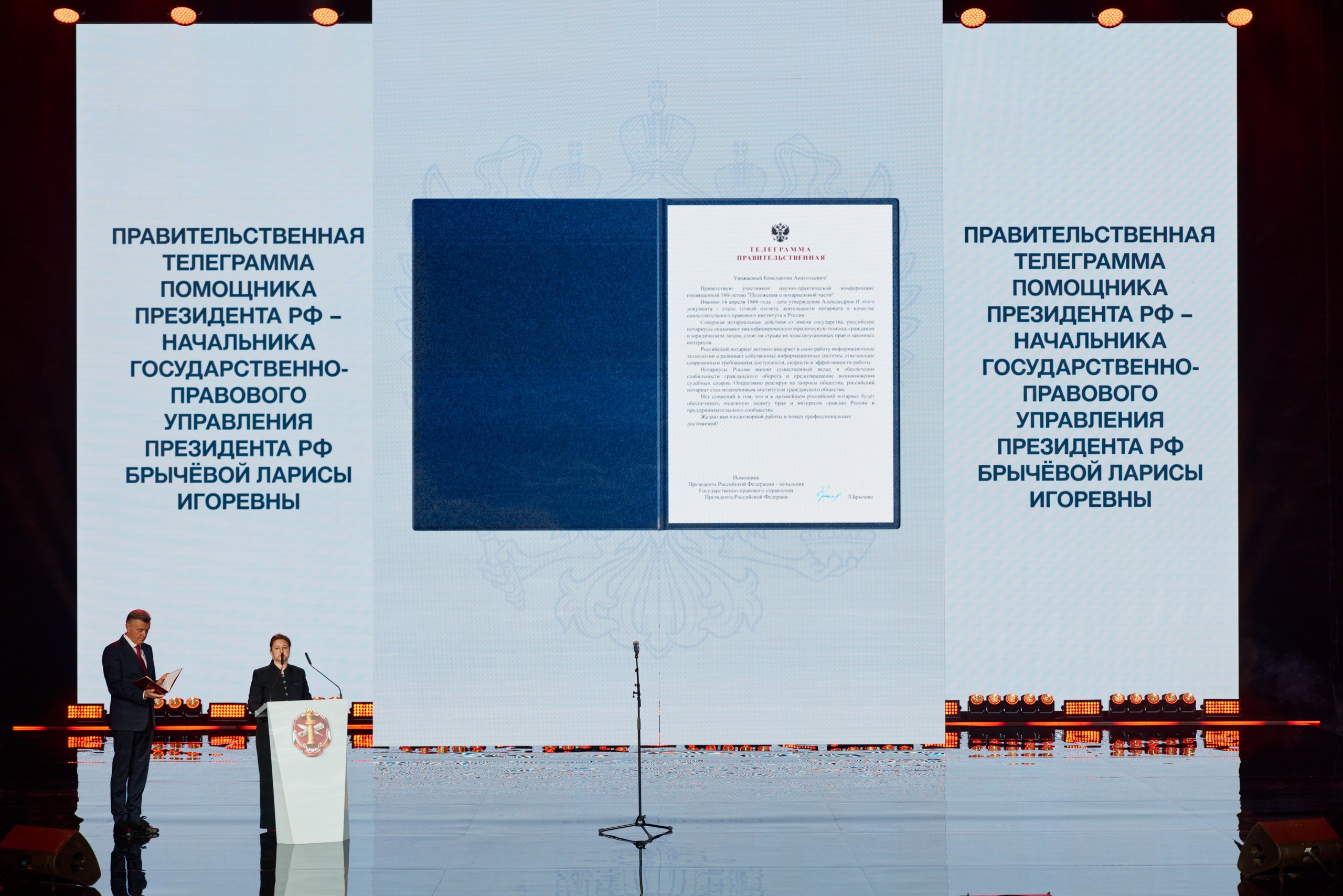 О передовых технологиях нотариата, помогающих оказывать квалифицированную юридическую помощь гражданам и представителям бизнеса, говорилось и в поздравлении помощника Президента РФ — начальника Государственно-правового управления Президента РФ Ларисы Брычевой.